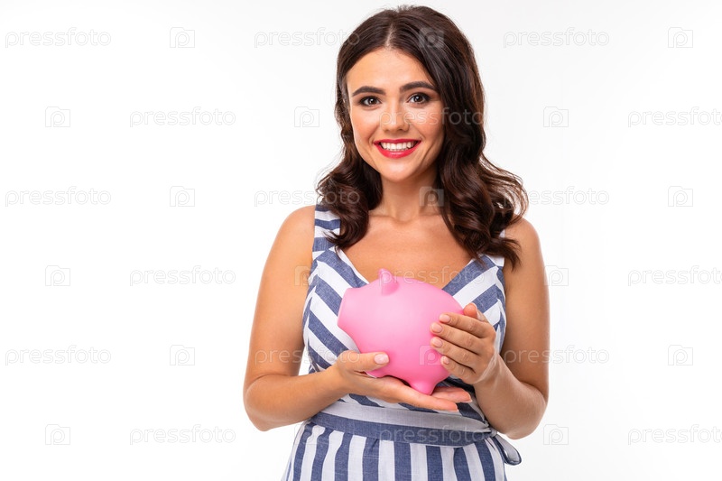 Улыбающаяся девушка в платье с копилкой в руках на белом фоне студии