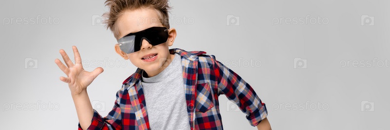 Красивый мальчик в клетчатой рубашке, серой рубашке и джинсах стоит на сером фоне. Мальчик в черных очках. Мальчик развел руки в стороны