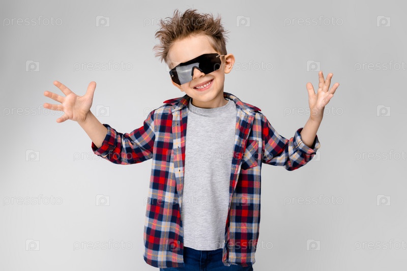 Красивый мальчик в клетчатой рубашке, серой рубашке и джинсах стоит на сером фоне. Мальчик в черных очках. Мальчик развел руки в стороны