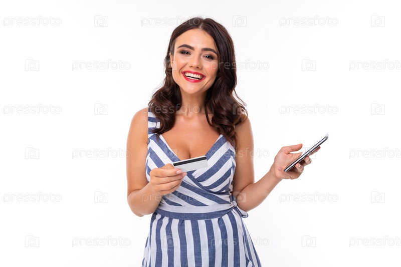 Молодая девушка с восхитительной улыбкой, плоскими зубами, красной помадой, длинными волнистыми каштановыми волосами, красивым макияжем, в бело-голубом платье в полоску с декольте, очках в белой оправе держит в руках телефон и карту