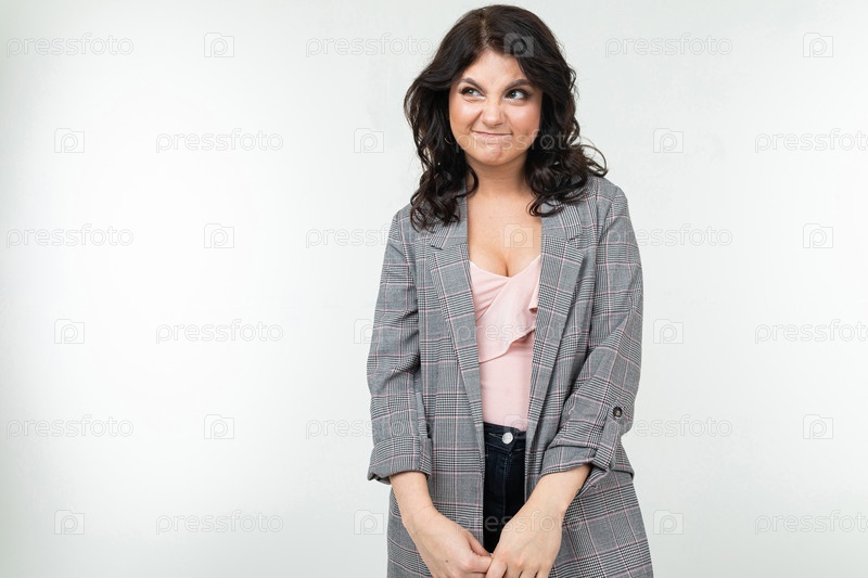 Портрет возмущенной девушки в сером клетчатом жакете на фоне белой студии