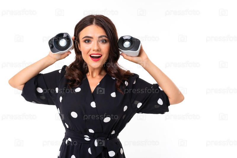 Улыбающаяся девушка с динамиками для музыки на белом фоне