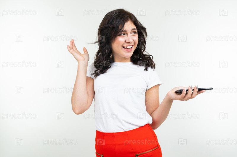 Милая девушка разговаривает по громкой связи телефона на фоне белой студии