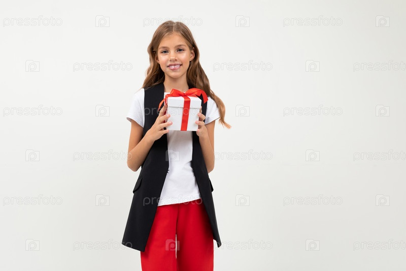 Красивая маленькая девочка в костюме стоит с подарком на белом фоне