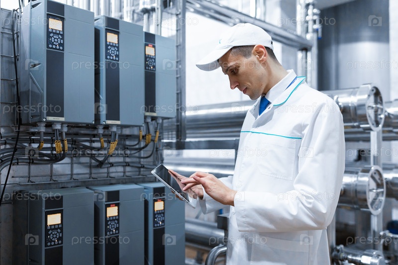 Портрет мужчины в белом халате и кепке, стоящего в производственном цехе молочной фабрики с серой табличкой