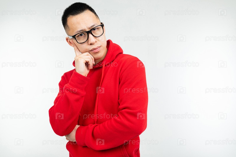 Красивая брюнетка азиатка в красном свитере и очках для зрения позирует на белом фоне
