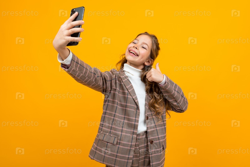 Милая улыбающаяся школьница в коричневой куртке фотографируется с протянутой рукой на смартфоне на желтом фоне