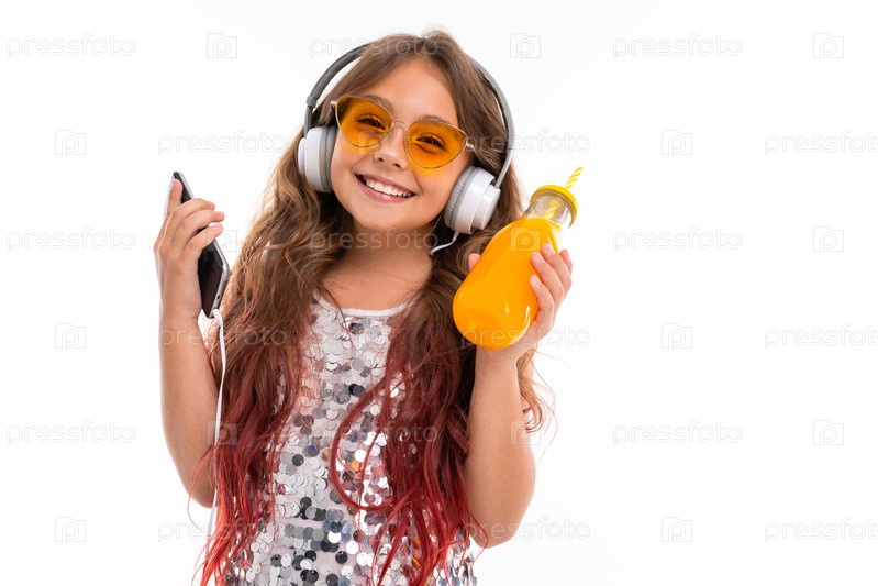 Девушка-подросток с длинными светлыми волосами, окрашенными в розовый цвет, в блестящем светлом платье, черно-белых кроссовках, стоит с наушниками, держит телефон и сок в стеклянной бутылке с полосатой трубкой в руке