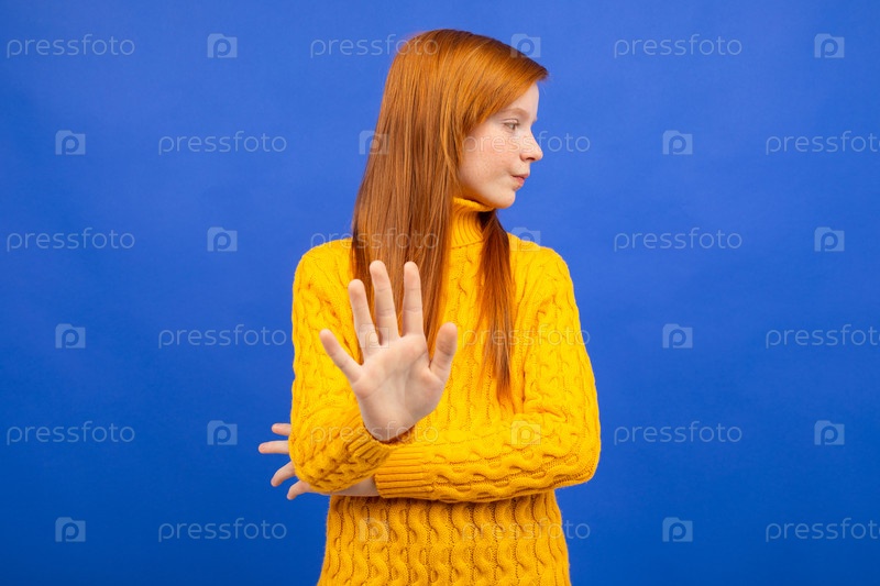 Обиженная европейская рыжеволосая девочка-подросток в желтом свитере отрицательно махала руками на синем фоне студии