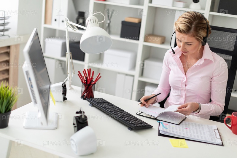 Красивая молодая девушка со светлыми волосами в розовой блузке работает в офисе. фото с глубиной резкости