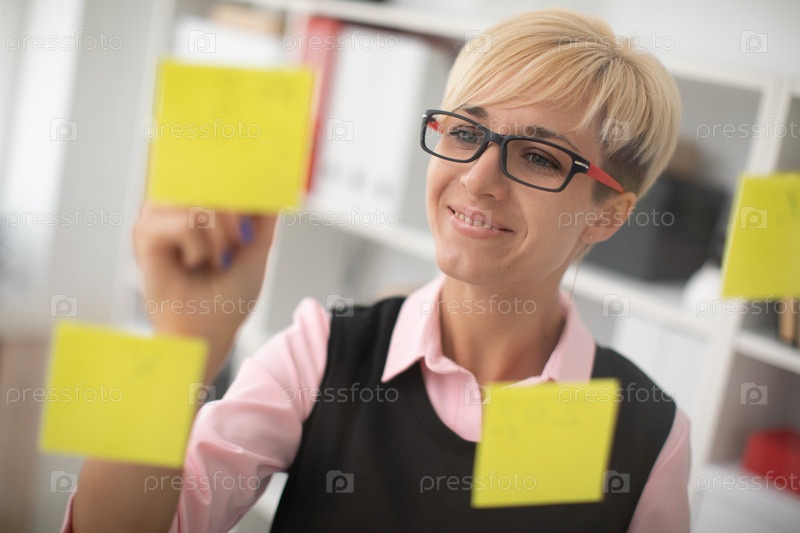 Красивая молодая девушка стоит возле стекла с наклейками и делает на них пометки. У девушки короткие белые волосы. На ней розовая рубашка и черная майка. фото с глубиной резкости