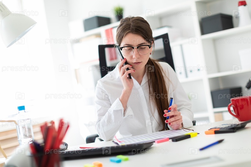 Очаровательная рыжеволосая девушка в очках и белой блузке работает в ярком офисе. фото с глубиной резкости
