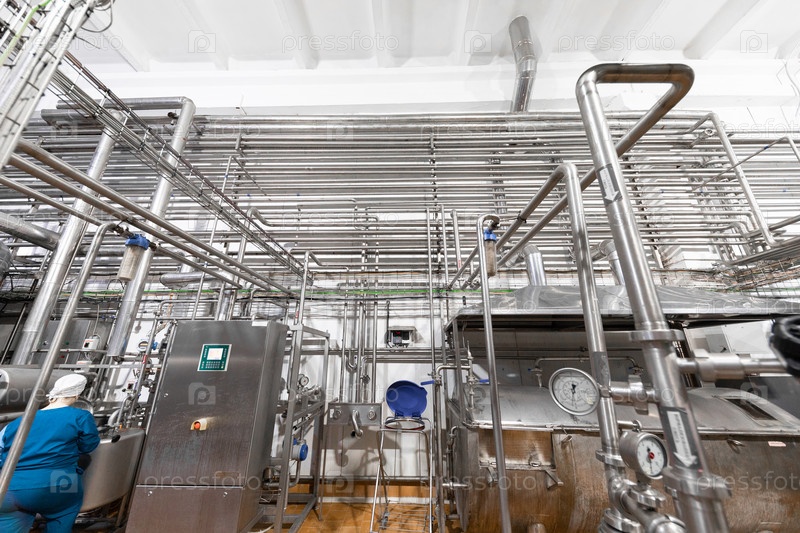 Работник производственного отдела настраивает линию, стоя возле оборудования молочного завода