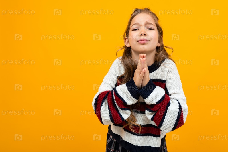 Симпатичная девочка-подросток в полосатом повседневном свитере спрашивает на желтом фоне с копией пространства