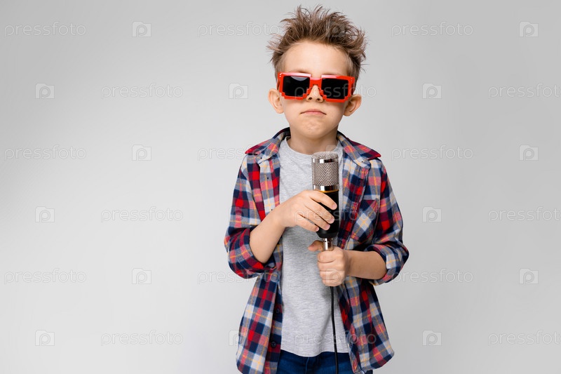 Очаровательный счастливый ребенок на сером фоне, волосы подняты