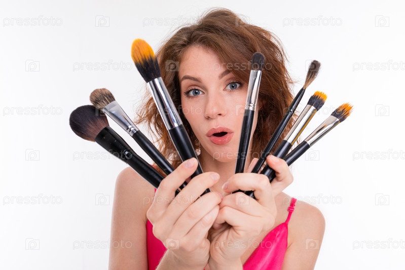 Молодая красивая девушка показывает свои кисти для макияжа, изолированные на белом фоне