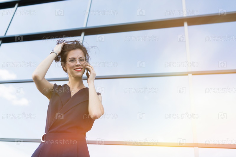 Девушка деловая женщина в костюме без рукавов разговаривает по телефону на фоне застекленного здания бизнес-центра