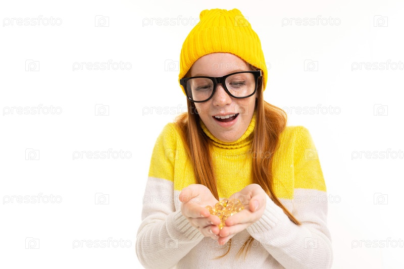 Улыбающаяся европейская рыжеволосая девушка в очках держит линзы на белом фоне студии