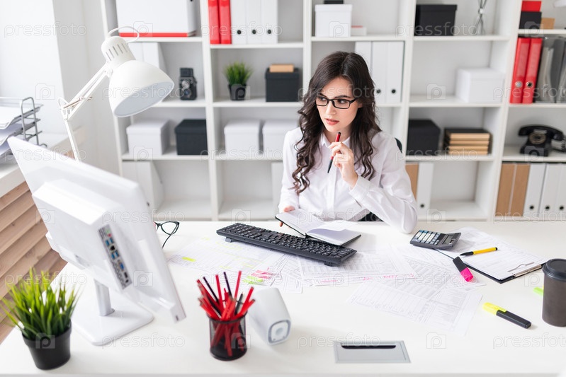 Молодая девушка работает за компьютером в офисе и держит в руке ручку и блокнот