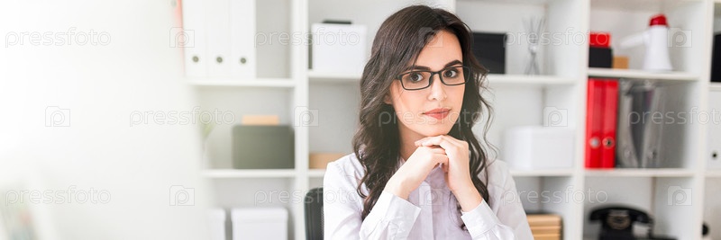 Красивая молодая девушка сидит за столом в офисе