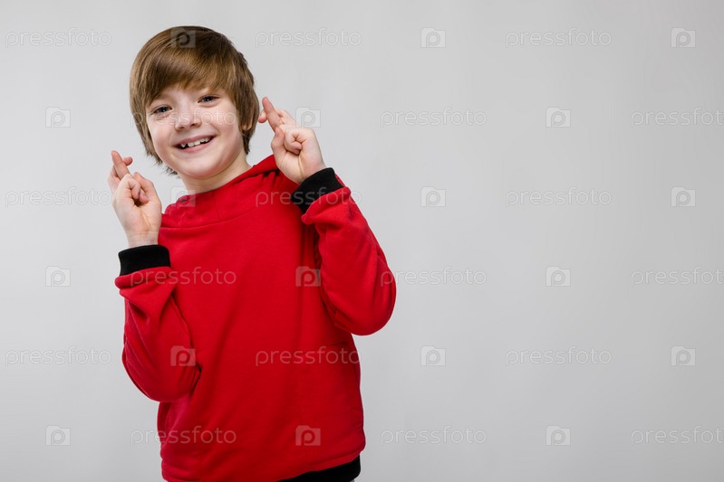 Симпатичный уверенный в себе маленький кавказский мальчик в красном свитере, показывающий жест надежды на сером фоне