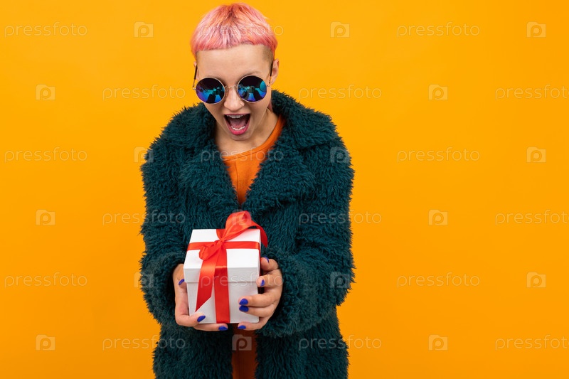 Счастливая девушка с розовыми волосами с пирсингом в носу и языке, одетая в шубу и очки, держит подарок на желтом фоне