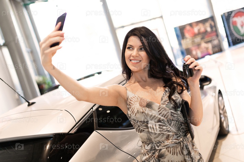 Замечательная брюнетка делает селфи и позирует рядом со своей новой машиной в салоне автосалона