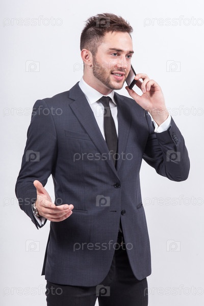 Изображение серьезного бизнесмена, стоящего с мобильным телефоном