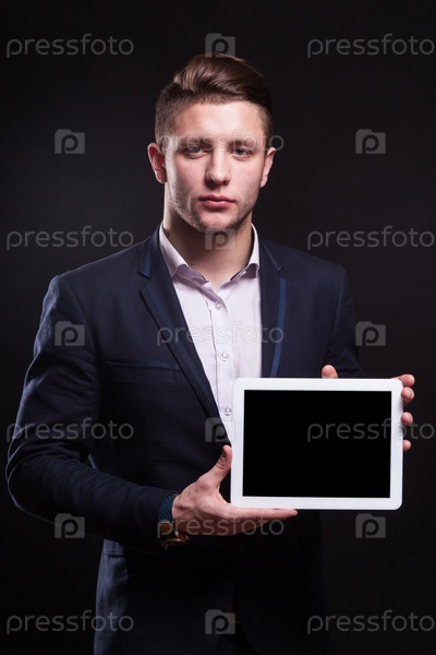 Изображение серьезного бизнесмена, стоящего с планшетом