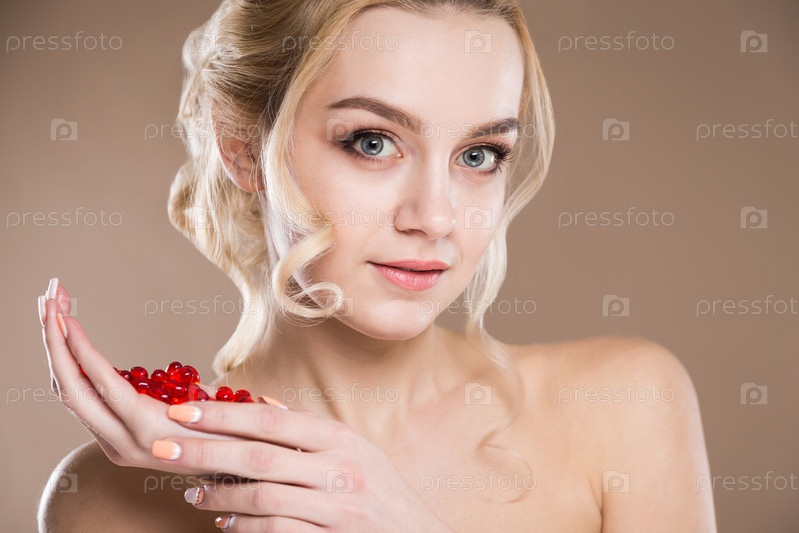 Большой портрет девушки с красными капсулами в руках