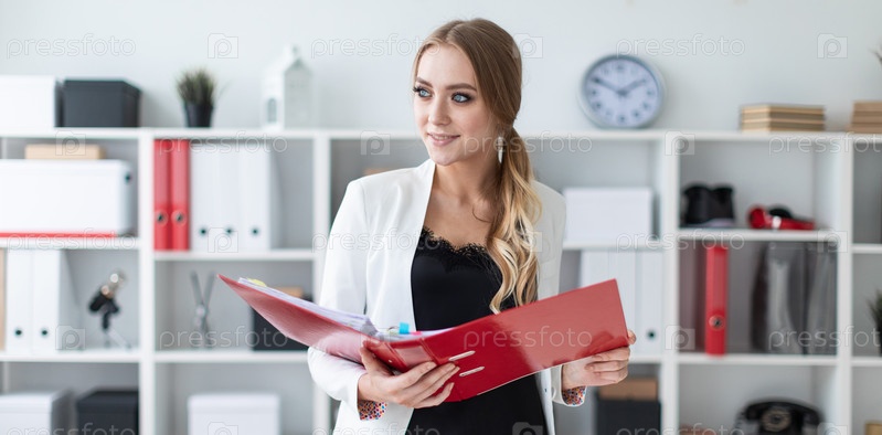 Молодая девушка стоит в кабинете рядом с полкой и держит в руках папку с документами