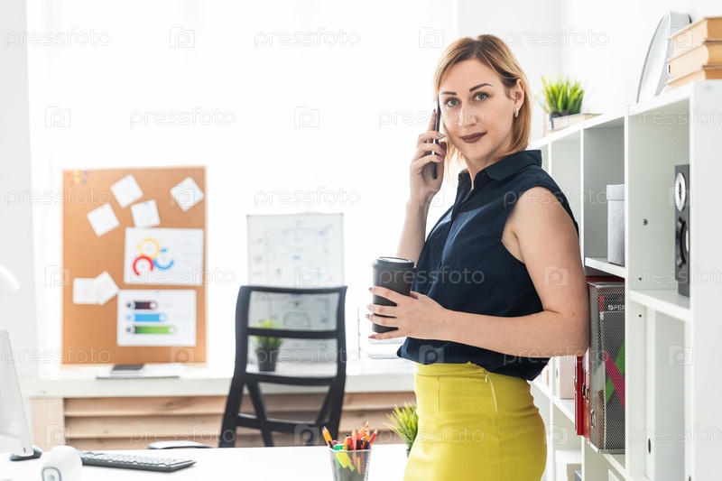 Молодая девушка разговаривает по телефону в офисе и держит стакан кофе