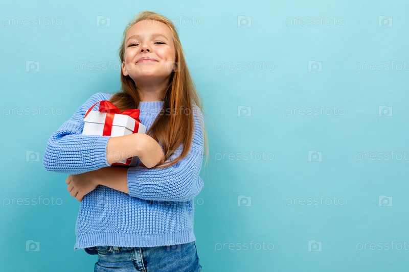 Copyspace фото красивой счастливой школьницы на синем фоне в объятиях с коробкой подарков