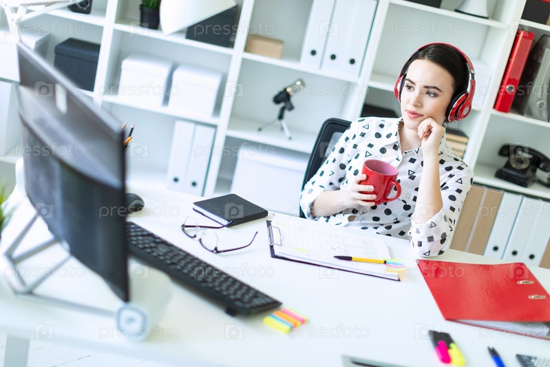 Молодая девушка сидит в наушниках за столом в офисе, держит в руках красную чашку и смотрит на монитор
