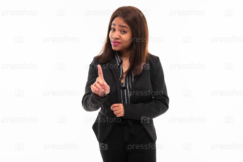Эмоциональная красивая афроамериканская молодая девушка в черном офисном костюме позирует изолированной на фоне макета