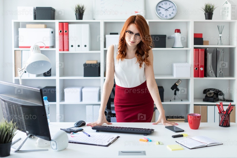 В офисе работает рыжеволосая девушка в очках, белой блузке и красной юбке. фото с глубиной резкости
