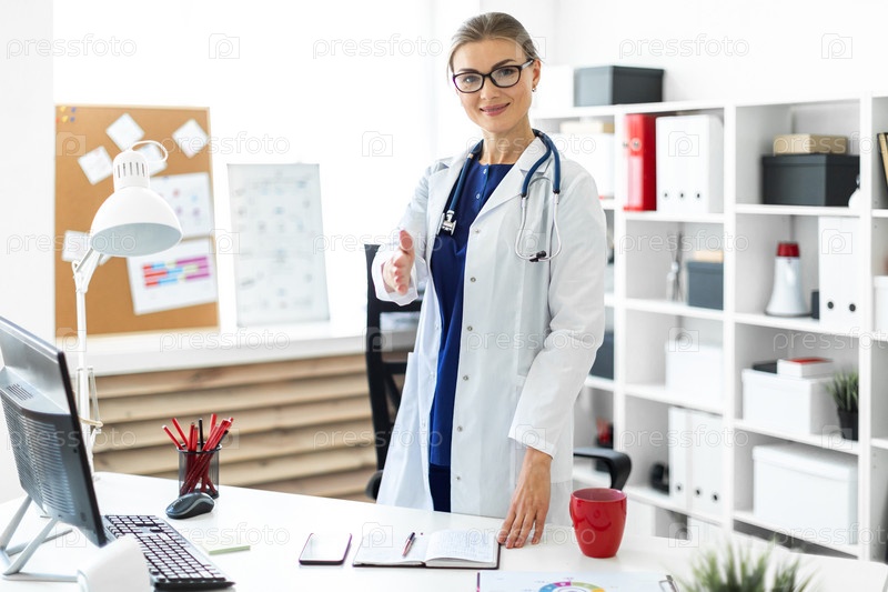 В офисе работает молодая девушка в очках и белом халате. фото с глубиной резкости