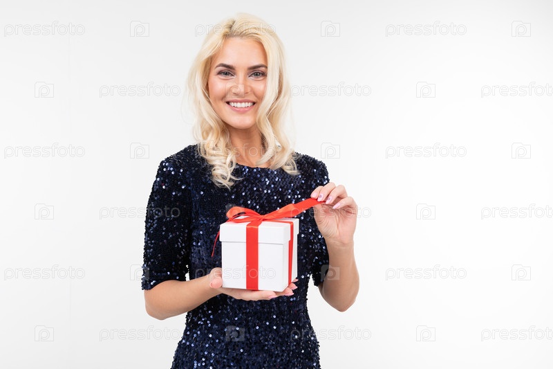 Белокурая белая женщина в синем блестящем платье радостно держит полученную подарочную коробку на белом фоне с копией пространства