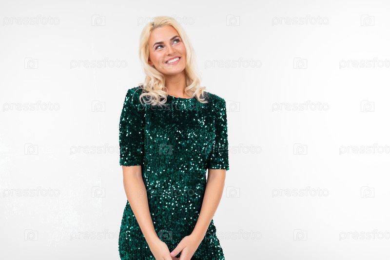 Радостная девушка в блестящем платье улыбается и флиртует на белом изолированном фоне