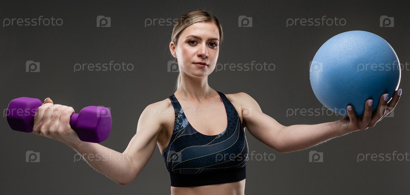Спортивная кавказская девушка со стройной фигурой делает упражнения с синим мячом и фиолетовым дамделлом, изолированным на черном фоне