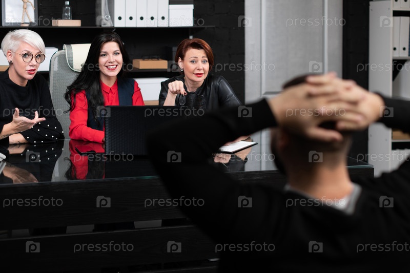 Молодой человек в интервью с тремя молодыми деловыми женщинами