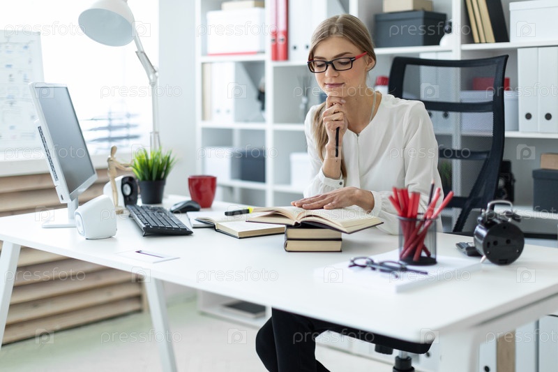Молодая девушка сидит за столом в офисе и держит в руке карандаш. Перед девушкой лежит открытая книга