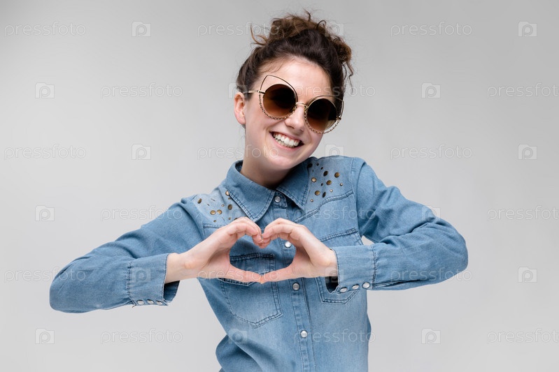 Молодая брюнетка в черных очках. Кошачьи очки. Волосы собраны в пучок. Девушка показывает руки сердца