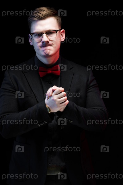Портрет уверенного в себе красивого серьезного элегантного ответственного бизнесмена, показывающего кулак на черном фоне