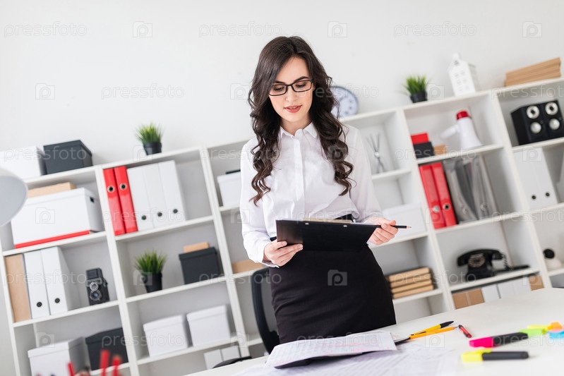 Красивая молодая девушка стоит возле офисного стола и держит в руках лист для заметок и карандаш