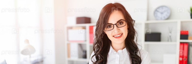 Красивая молодая девушка стоит возле офисного стола, сложив руки на груди