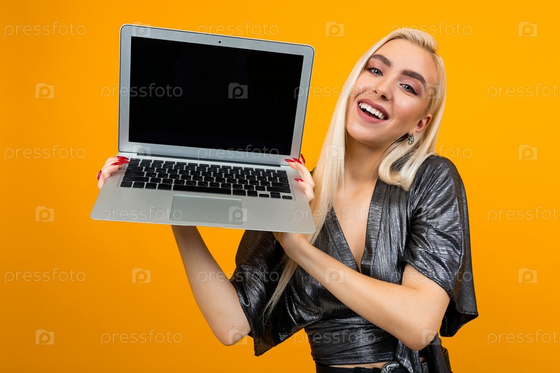 Улыбающаяся очаровательная блондинка с пустым экраном ноутбука на фоне желтой стены