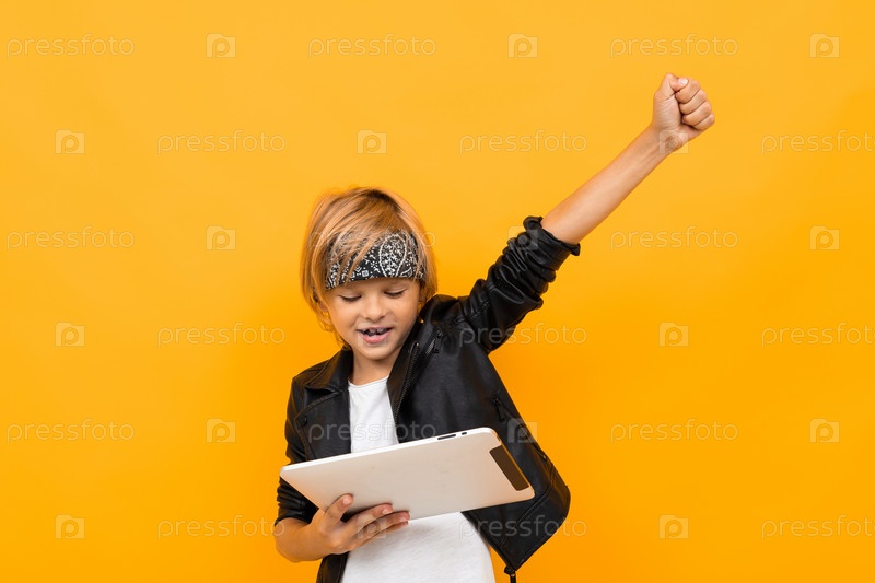 Европейский мальчик с планшетом поднял руку на оранжевом фоне