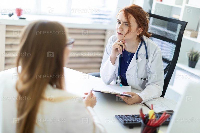Рыжеволосая девушка в белом халате и со стетоскопом на шее. Волосы собраны в пучок. фото с глубиной резкости