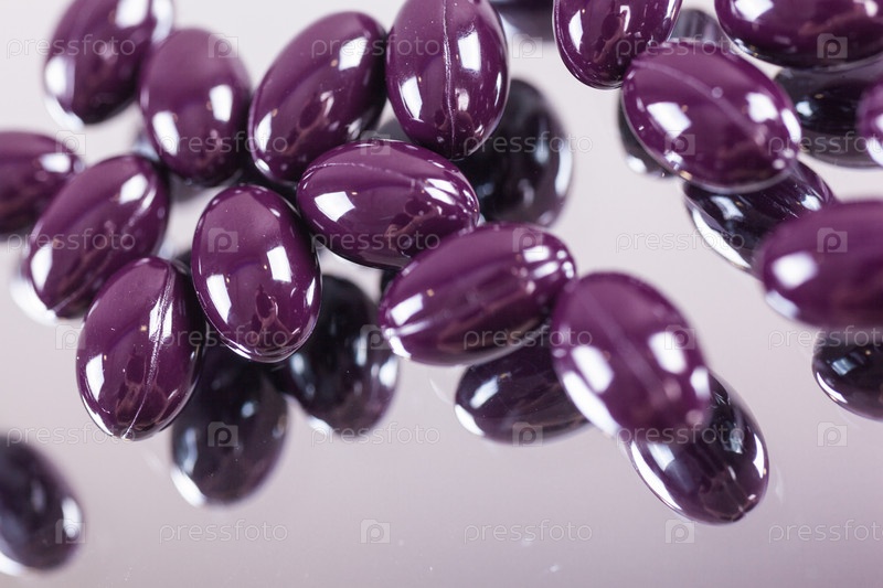 Капсулы фиолетовые таблетки крупным планом на зеркальной поверхности